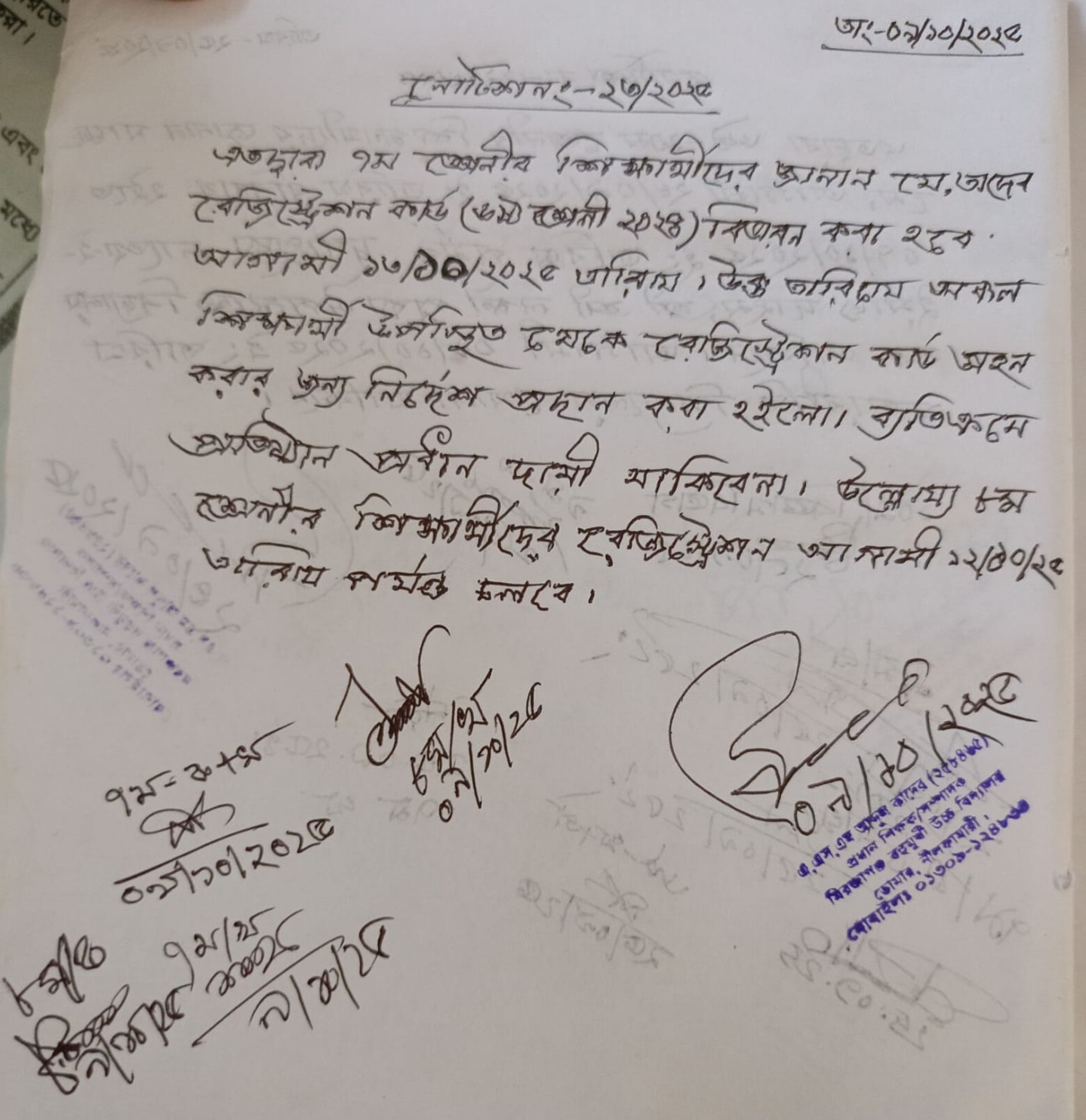 সপ্তম শ্রেণী/২০২৪ রেজিস্ট্রেশন কার্ড বিতরণ ও অষ্টম শ্রেণীর রেজিস্ট্রেশনের সময় বৃদ্ধি করন প্রসঙ্গে।