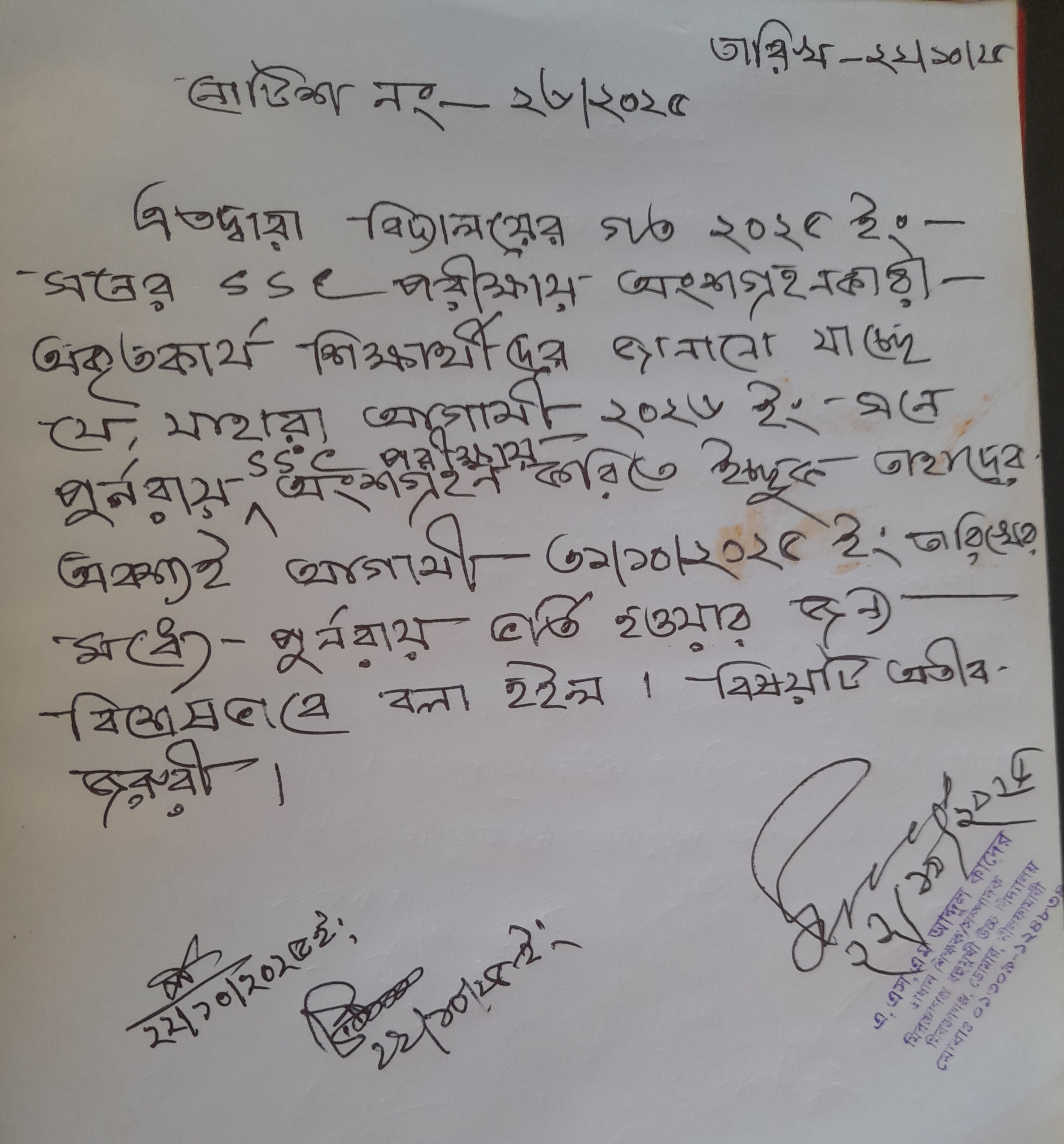 এসএসসি /২০২৫ইং সনে অকৃতকার্য পরীক্ষার্থীগণ পুনরায় ২০২৬ইং সনে পরীক্ষায় অংশগ্রহণের জন্য বিদ্যালয়ে ভর্তি প্রসঙ্গে।
